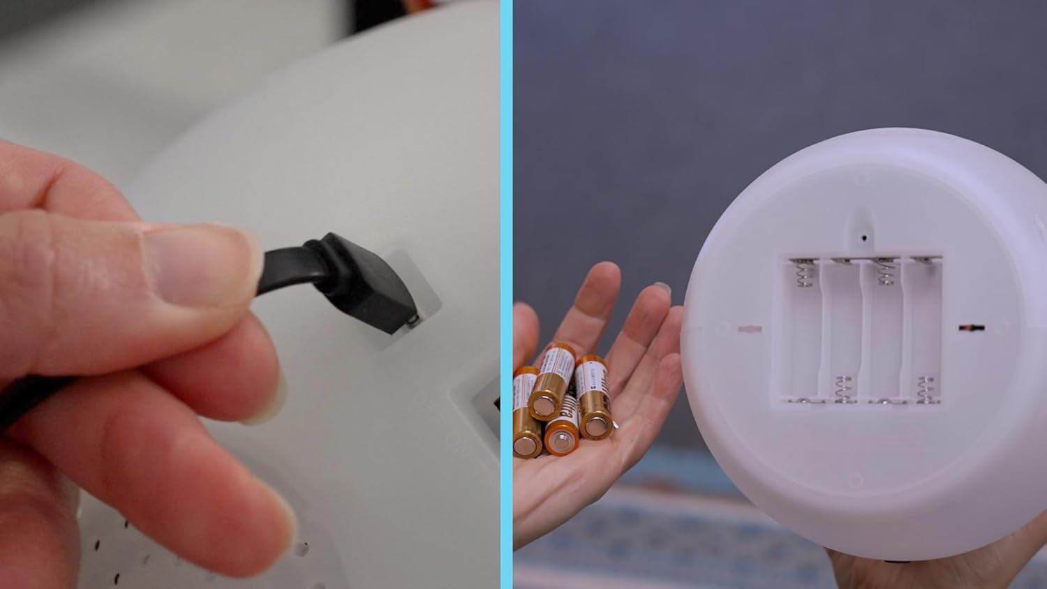 ➡︎ Select power supply: Install 4 AA batteries, or connect a USB cable to a power adapter/power bank.